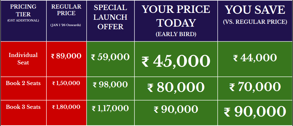 Note: Early Bird Pricing (INR 45,000 for 1, INR 40,000 per person for 2, INR 30,000 per person for 3+) is valid for the first 7 seats of each batch and/or until 3 weeks before the workshop date. Special Launch Offer (INR 59,000 per person) ends on December 31, 2025, 11:59 pm.