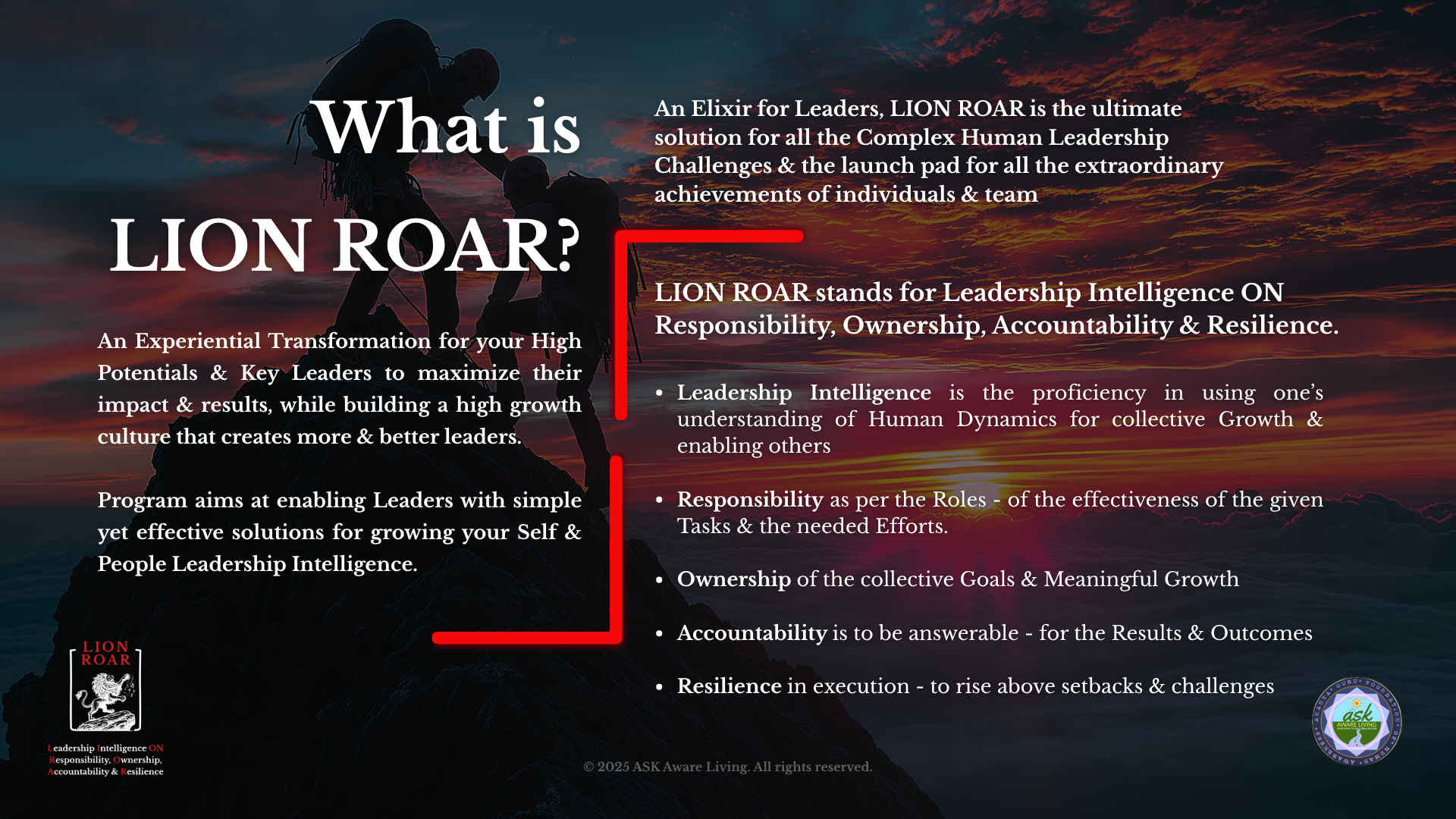 An Elixir for Leaders, LION ROAR is the ultimate solution for all the Complex Human Leadership Challenges & the launch pad for all the extraordinary achievements of individuals & teams._